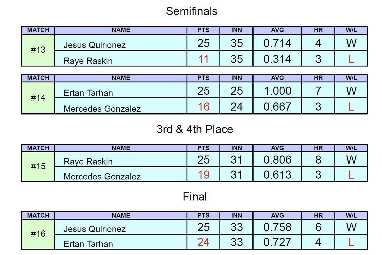 Jesus Quinones, by a margin of just one billiard, defeated Ertan Tarhan to win the first USBA/Gabriels Tour B Tournament. The event was held January 16-18 at the Casino Del Sol Resort in Tucson, Arizona. Complete charts from Qualifications through the Finals follows.